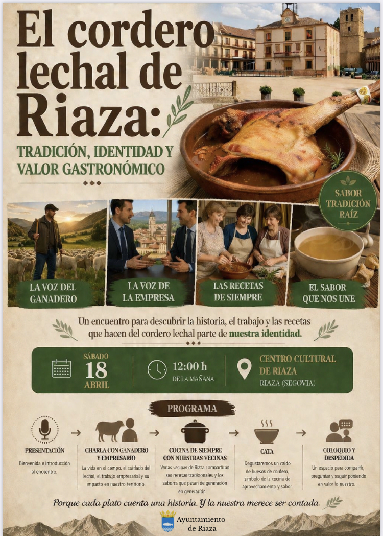 Como ya hemos anunciado, el próximo fin de semana, 18 y 19 de abril, tendrán lugar las Jornadas del Cordero lechal de Riaza. Además de lo ya informado acerca de los bares y restaurantes adheridos en esta ocasión, queremos comunicarles el resto de actividades que, entorno a este producto, van a llevarse a cabo. El sábado 18 de abril, a las 12:00 horas, en el Centro Cultural Nuestra Señora del Manto de Riaza, encuentro para descubrir la historia, el trabajo y las recetas que hacen del cordero lechal de Riaza parte de nuestra identidad.