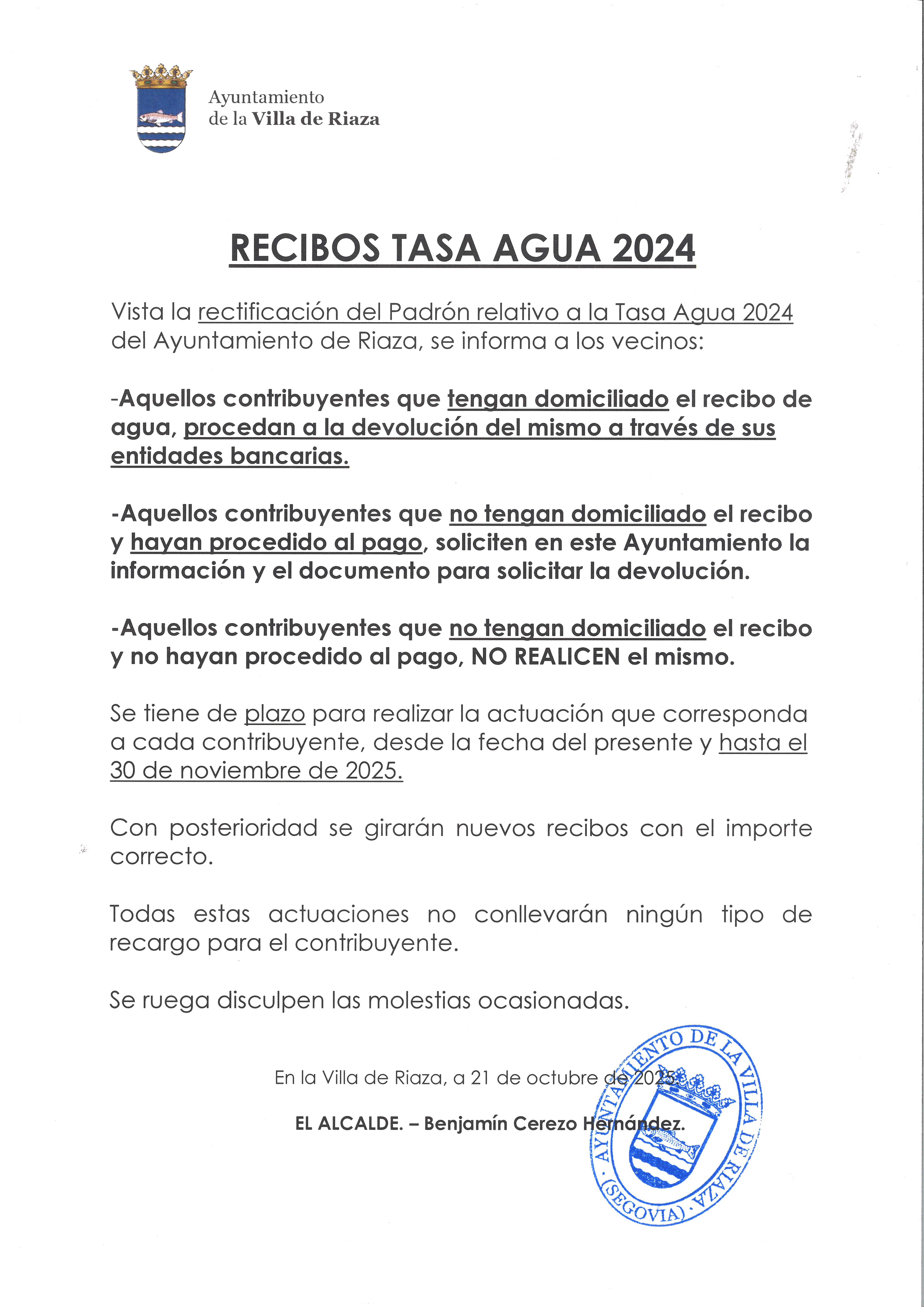 Vista la rectificación del Padrón relativo a la Tasa Agua 2024 del Ayuntamiento de Riaza, se informa a los vecinos: