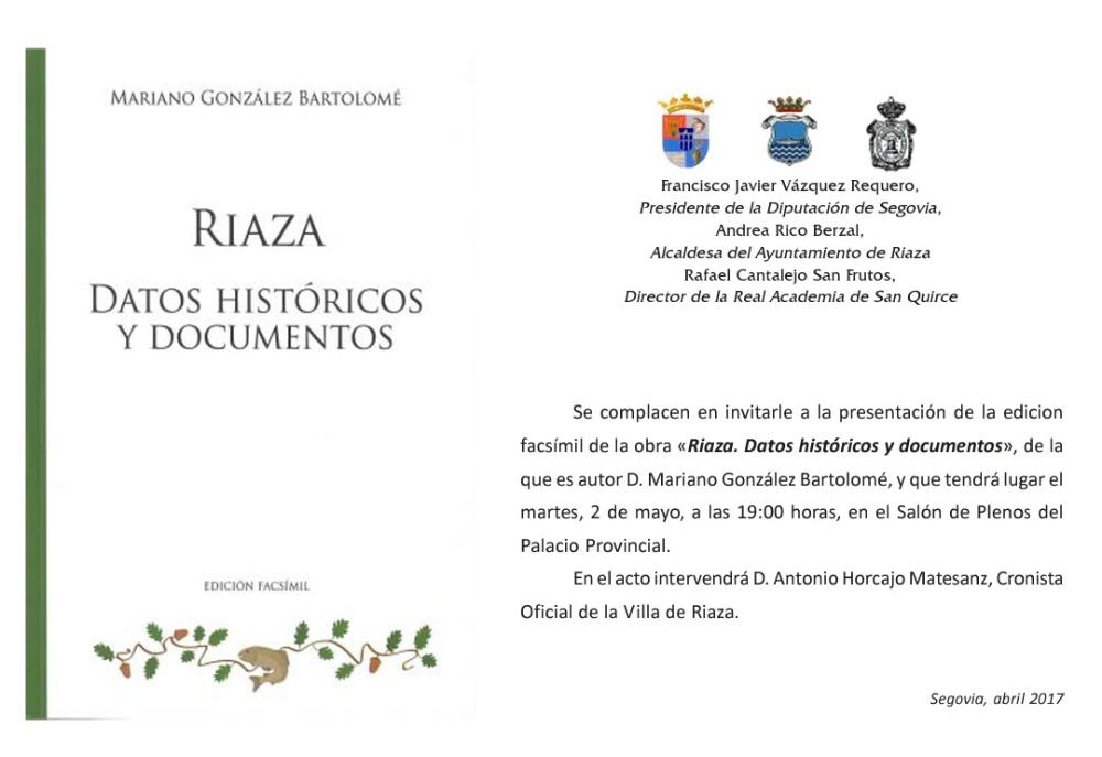 El Ayuntamiento presenta la reedición en facsímil del primer estudio histórico sobre la villa de Riaza escrito por Mariano González Bartolomé. La reedición facsímil se ha llevado a cabo en colaboración con la Diputación Provincial de Segovia y con la Real Academia de Historia y Arte de San Quirce.